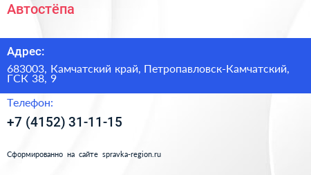Автостёпа по адресу 683003, Камчатский край, Петропавловск-Камчатский, ГСК 38, 9 в дальнейшем Организация, размещена в следующих категориях: