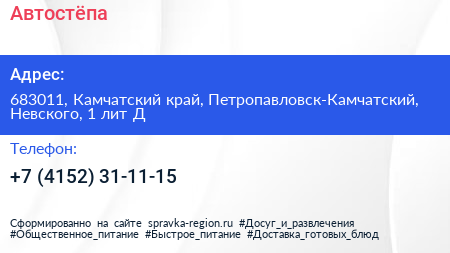 Автостёпа по адресу 683011, Камчатский край, Петропавловск-Камчатский, Невского, 1 лит Д в дальнейшем Организация, размещена в следующих категориях: