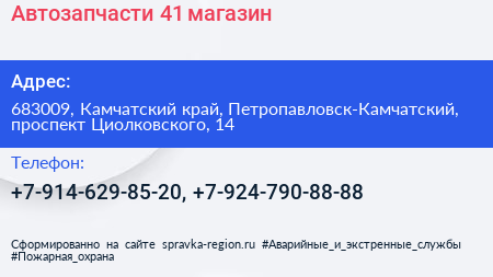 Автозапчасти 41, магазин по адресу 683009, Камчатский край, Петропавловск-Камчатский, проспект Циолковского, 14 в дальнейшем Организация, размещена в следующих категориях: