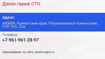 Джем-гараж, СТО по адресу 683009, Камчатский край, Петропавловск-Камчатский, ГСК 151, 216 в дальнейшем Организация, размещена в следующих категориях: