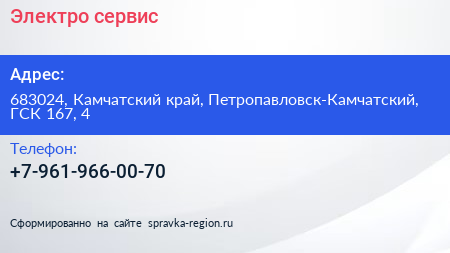 Электро-сервис по адресу 683024, Камчатский край, Петропавловск-Камчатский, ГСК 167, 4 в дальнейшем Организация, размещена в следующих категориях: