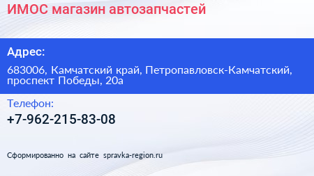 ИМОС, магазин автозапчастей по адресу 683006, Камчатский край, Петропавловск-Камчатский, проспект Победы, 20а в дальнейшем Организация, размещена в следующих категориях: