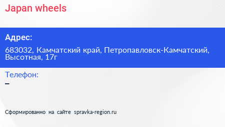 Japan wheels по адресу 683032, Камчатский край, Петропавловск-Камчатский, Высотная, 17г в дальнейшем Организация, размещена в следующих категориях:
