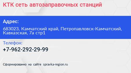 КТК, сеть автозаправочных станций по адресу 683023, Камчатский край, Петропавловск-Камчатский, Кавказская, 7а стр1 в дальнейшем Организация, размещена в следующих категориях:
