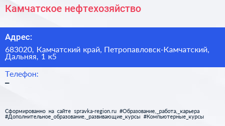Камчатское нефтехозяйство по адресу 683020, Камчатский край, Петропавловск-Камчатский, Дальняя, 1 к5 в дальнейшем Организация, размещена в следующих категориях:
