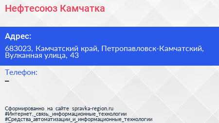 Нефтесоюз Камчатка по адресу 683023, Камчатский край, Петропавловск-Камчатский, Вулканная улица, 43 в дальнейшем Организация, размещена в следующих категориях: