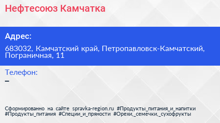 Нефтесоюз Камчатка по адресу 683032, Камчатский край, Петропавловск-Камчатский, Пограничная, 11 в дальнейшем Организация, размещена в следующих категориях: