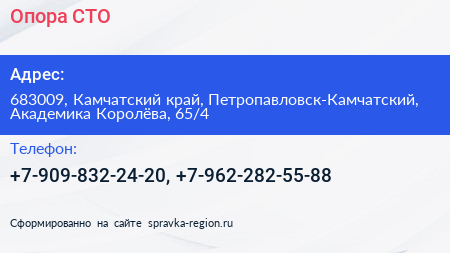 Опора, СТО по адресу 683009, Камчатский край, Петропавловск-Камчатский, Академика Королёва, 65/4 в дальнейшем Организация, размещена в следующих категориях: