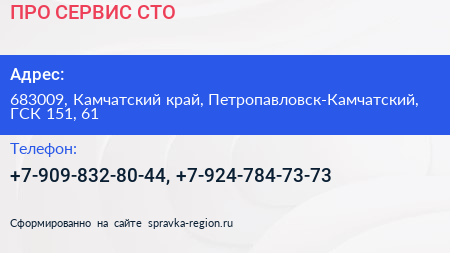 ПРО-СЕРВИС, СТО по адресу 683009, Камчатский край, Петропавловск-Камчатский, ГСК 151, 61 в дальнейшем Организация, размещена в следующих категориях: