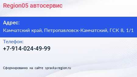 Region05, автосервис по адресу Камчатский край, Петропавловск-Камчатский, ГСК 8, 1/1 в дальнейшем Организация, размещена в следующих категориях: