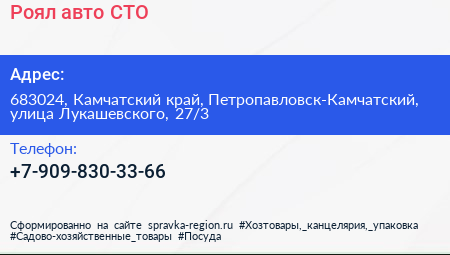 Роял-авто, СТО по адресу 683024, Камчатский край, Петропавловск-Камчатский, улица Лукашевского, 27/3 в дальнейшем Организация, размещена в следующих категориях: