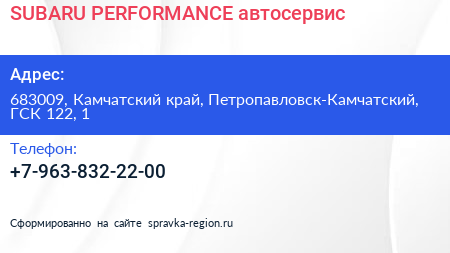 SUBARU PERFORMANCE, автосервис по адресу 683009, Камчатский край, Петропавловск-Камчатский, ГСК 122, 1 в дальнейшем Организация, размещена в следующих категориях: