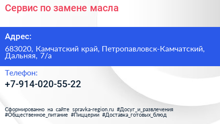 Сервис по замене масла по адресу 683020, Камчатский край, Петропавловск-Камчатский, Дальняя, 7/а в дальнейшем Организация, размещена в следующих категориях: