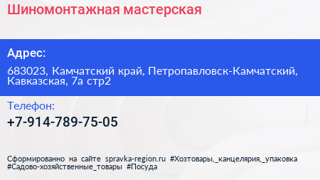Шиномонтажная мастерская по адресу 683023, Камчатский край, Петропавловск-Камчатский, Кавказская, 7а стр2 в дальнейшем Организация, размещена в следующих категориях: