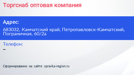 Торгснаб, оптовая компания по адресу 683032, Камчатский край, Петропавловск-Камчатский, Пограничная, 60/2а в дальнейшем Организация, размещена в следующих категориях: