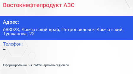 Востокнефтепродукт, АЗС по адресу 683023, Камчатский край, Петропавловск-Камчатский, Тушканова, 22 в дальнейшем Организация, размещена в следующих категориях: