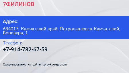 7ФИЛИНОВ по адресу 684017, Камчатский край, Петропавловск-Камчатский, Бонивура, 1 в дальнейшем Организация, размещена в следующих категориях:
