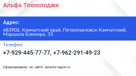 Альфа-Технолоджи по адресу 683902, Камчатский край, Петропавловск-Камчатский, Маршала Блюхера, 33 в дальнейшем Организация, размещена в следующих категориях: