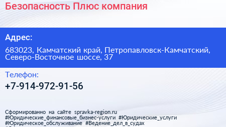 Безопасность Плюс, компания по адресу 683023, Камчатский край, Петропавловск-Камчатский, Северо-Восточное шоссе, 37 в дальнейшем Организация, размещена в следующих категориях: