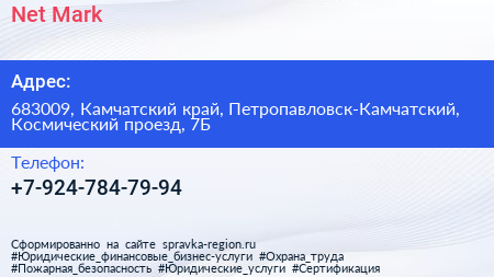 Net-Mark по адресу 683009, Камчатский край, Петропавловск-Камчатский, Космический проезд, 7Б в дальнейшем Организация, размещена в следующих категориях: