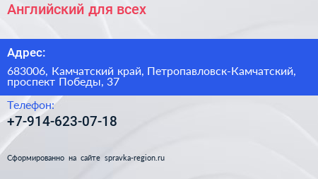 Английский для всех по адресу 683006, Камчатский край, Петропавловск-Камчатский, проспект Победы, 37 в дальнейшем Организация, размещена в следующих категориях:
