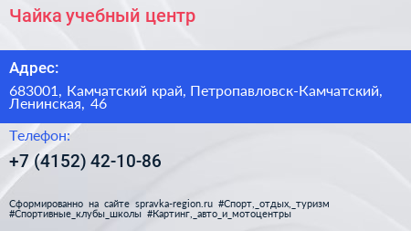 Чайка, учебный центр по адресу 683001, Камчатский край, Петропавловск-Камчатский, Ленинская, 46 в дальнейшем Организация, размещена в следующих категориях: