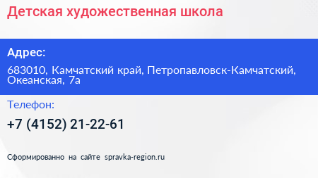 Детская художественная школа по адресу 683010, Камчатский край, Петропавловск-Камчатский, Океанская, 7а в дальнейшем Организация, размещена в следующих категориях: