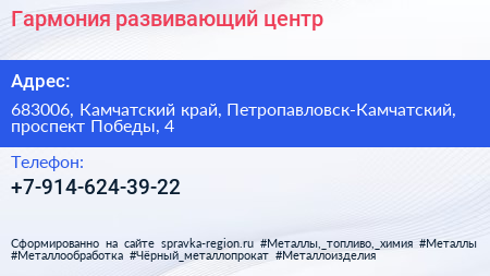 Гармония, развивающий центр по адресу 683006, Камчатский край, Петропавловск-Камчатский, проспект Победы, 4 в дальнейшем Организация, размещена в следующих категориях: