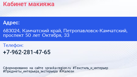 Кабинет макияжа по адресу 683024, Камчатский край, Петропавловск-Камчатский, проспект 50 лет Октября, 33 в дальнейшем Организация, размещена в следующих категориях: