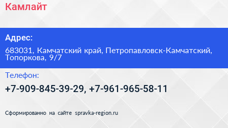 Камлайт по адресу 683031, Камчатский край, Петропавловск-Камчатский, Топоркова, 9/7 в дальнейшем Организация, размещена в следующих категориях: