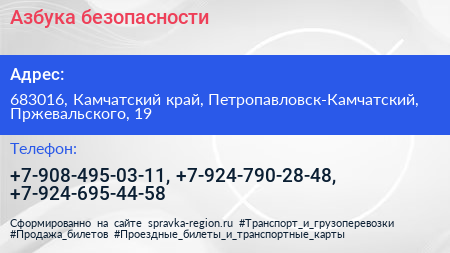 Азбука безопасности по адресу 683016, Камчатский край, Петропавловск-Камчатский, Пржевальского, 19 в дальнейшем Организация, размещена в следующих категориях: