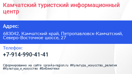 Камчатский туристский информационный центр по адресу 683042, Камчатский край, Петропавловск-Камчатский, Северо-Восточное шоссе, 27 в дальнейшем Организация, размещена в следующих категориях: