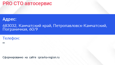 PRO-СТО, автосервис по адресу 683032, Камчатский край, Петропавловск-Камчатский, Пограничная, 60/9 в дальнейшем Организация, размещена в следующих категориях:
