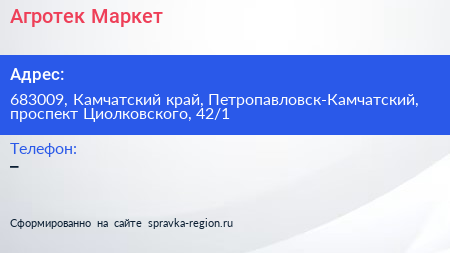 Агротек Маркет по адресу 683009, Камчатский край, Петропавловск-Камчатский, проспект Циолковского, 42/1 в дальнейшем Организация, размещена в следующих категориях: