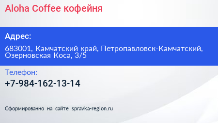 Aloha Coffee, кофейня по адресу 683001, Камчатский край, Петропавловск-Камчатский, Озерновская Коса, 3/5 в дальнейшем Организация, размещена в следующих категориях:
