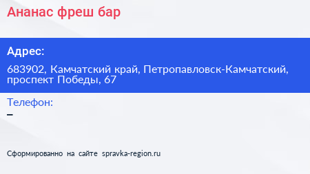 Ананас, фреш-бар по адресу 683902, Камчатский край, Петропавловск-Камчатский, проспект Победы, 67 в дальнейшем Организация, размещена в следующих категориях: