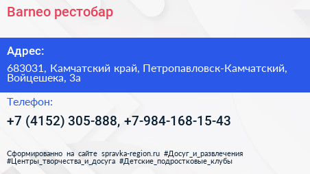 Barneo, рестобар по адресу 683031, Камчатский край, Петропавловск-Камчатский, Войцешека, 3а в дальнейшем Организация, размещена в следующих категориях: