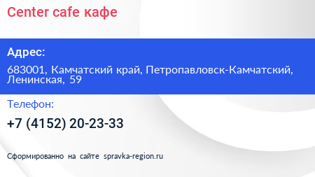 Center cafe, кафе по адресу 683001, Камчатский край, Петропавловск-Камчатский, Ленинская, 59 в дальнейшем Организация, размещена в следующих категориях: