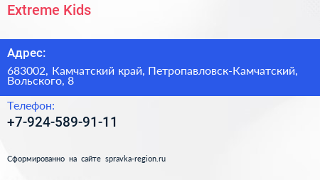 Extreme Kids по адресу 683002, Камчатский край, Петропавловск-Камчатский, Вольского, 8 в дальнейшем Организация, размещена в следующих категориях: