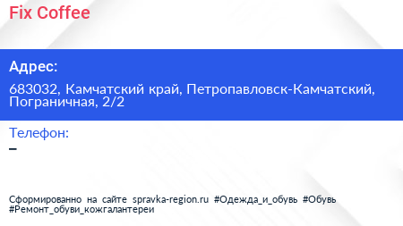 Fix Coffee по адресу 683032, Камчатский край, Петропавловск-Камчатский, Пограничная, 2/2 в дальнейшем Организация, размещена в следующих категориях: