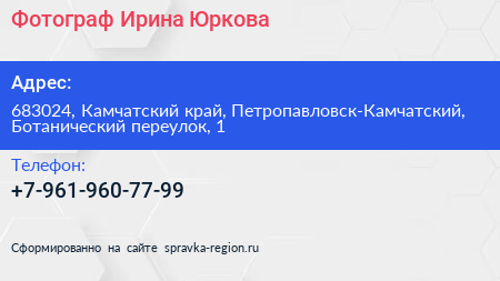 Фотограф Ирина Юркова по адресу 683024, Камчатский край, Петропавловск-Камчатский, Ботанический переулок, 1 в дальнейшем Организация, размещена в следующих категориях: