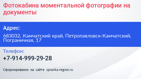 Фотокабина моментальной фотографии на документы по адресу 683032, Камчатский край, Петропавловск-Камчатский, Пограничная, 17 в дальнейшем Организация, размещена в следующих категориях: