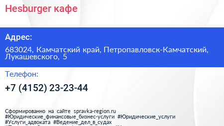 Hesburger, кафе по адресу 683024, Камчатский край, Петропавловск-Камчатский, Лукашевского, 5 в дальнейшем Организация, размещена в следующих категориях: