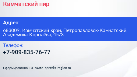 Камчатский пир по адресу 683009, Камчатский край, Петропавловск-Камчатский, Академика Королёва, 45/3 в дальнейшем Организация, размещена в следующих категориях: