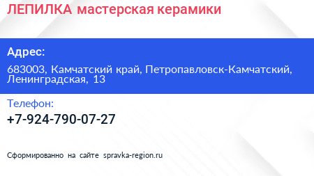 ЛЕПИЛКА, мастерская керамики по адресу 683003, Камчатский край, Петропавловск-Камчатский, Ленинградская, 13 в дальнейшем Организация, размещена в следующих категориях:
