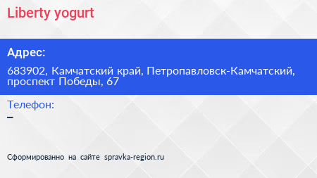 Liberty yogurt по адресу 683902, Камчатский край, Петропавловск-Камчатский, проспект Победы, 67 в дальнейшем Организация, размещена в следующих категориях: