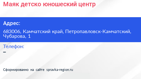 Маяк, детско-юношеский центр по адресу 683006, Камчатский край, Петропавловск-Камчатский, Чубарова, 1 в дальнейшем Организация, размещена в следующих категориях: