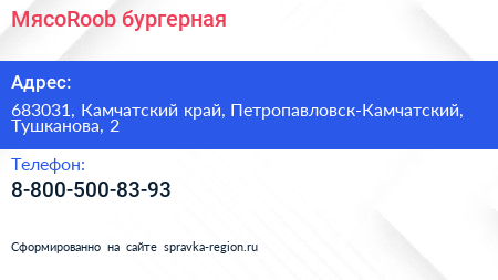 МясоRoob, бургерная по адресу 683031, Камчатский край, Петропавловск-Камчатский, Тушканова, 2 в дальнейшем Организация, размещена в следующих категориях:
