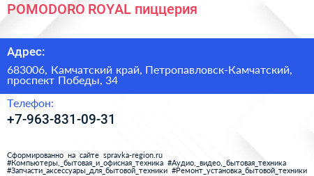 POMODORO ROYAL, пиццерия по адресу 683006, Камчатский край, Петропавловск-Камчатский, проспект Победы, 34 в дальнейшем Организация, размещена в следующих категориях: