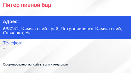 Питер, пивной бар по адресу 683042, Камчатский край, Петропавловск-Камчатский, Савченко, 6а в дальнейшем Организация, размещена в следующих категориях: